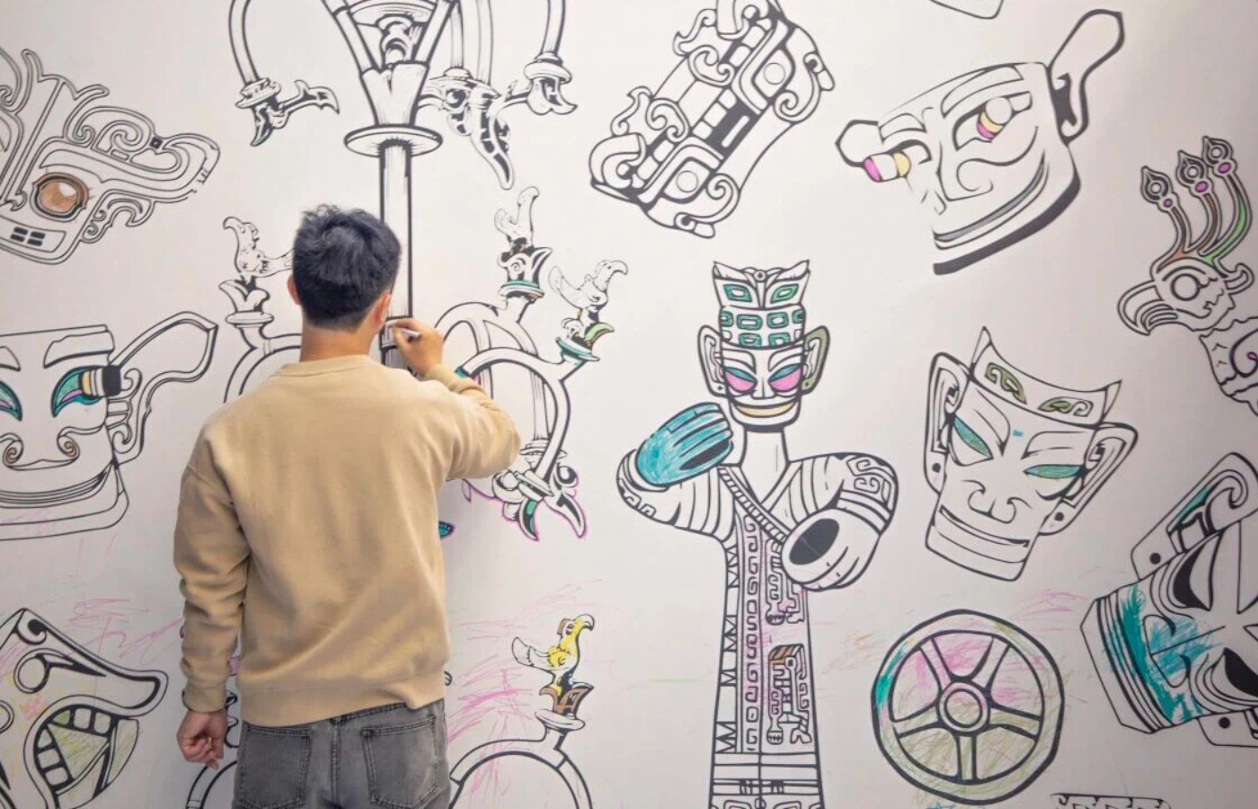 زائرٌ يُلوّن رسوماتٍ لآثار "سانشينغدوي" في المعرض.
